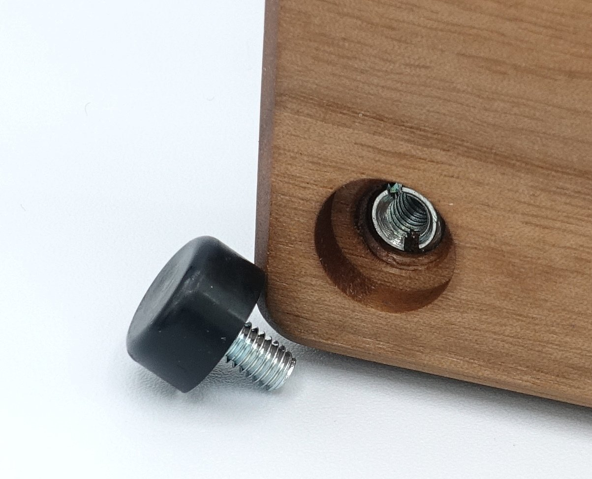 - Wir stellen unsere eigenen Schraub-Kautschuk-Füße her, indem wir eine Schraube mit dem Kopf voran teilversenkt schwebend über einer Negativform fixieren, die dann mit Gießkautschuk gefüllt wird.